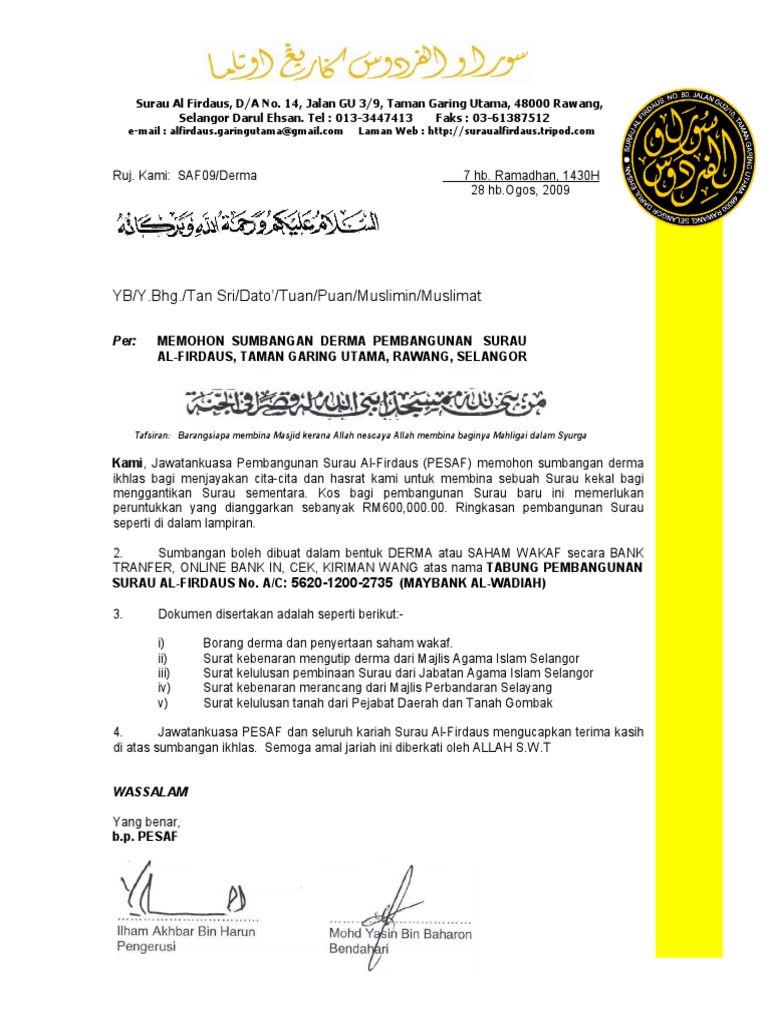 Contoh Surat Memohon Sumbangan Derma Pembangunan Surau Alfirdaus Taman Garing Utama Rawang Selangor Pdf